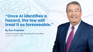 Read the full article: Law360 — “AI Product Safety Insights May Expand Foreseeability,” by Donald R. Fountain